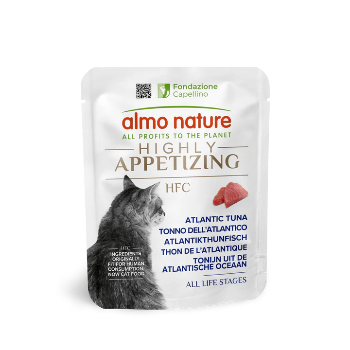 Almo Nature HFC Highly Appetizing is prepared exclusively with ingredients originally intended for human consumption, carefully selected by Almo Nature, and now processed into cat food. The pouch, made of both plastic and aluminum, ensures optimal shelf life and can be reused to produce energy when processed correctly.