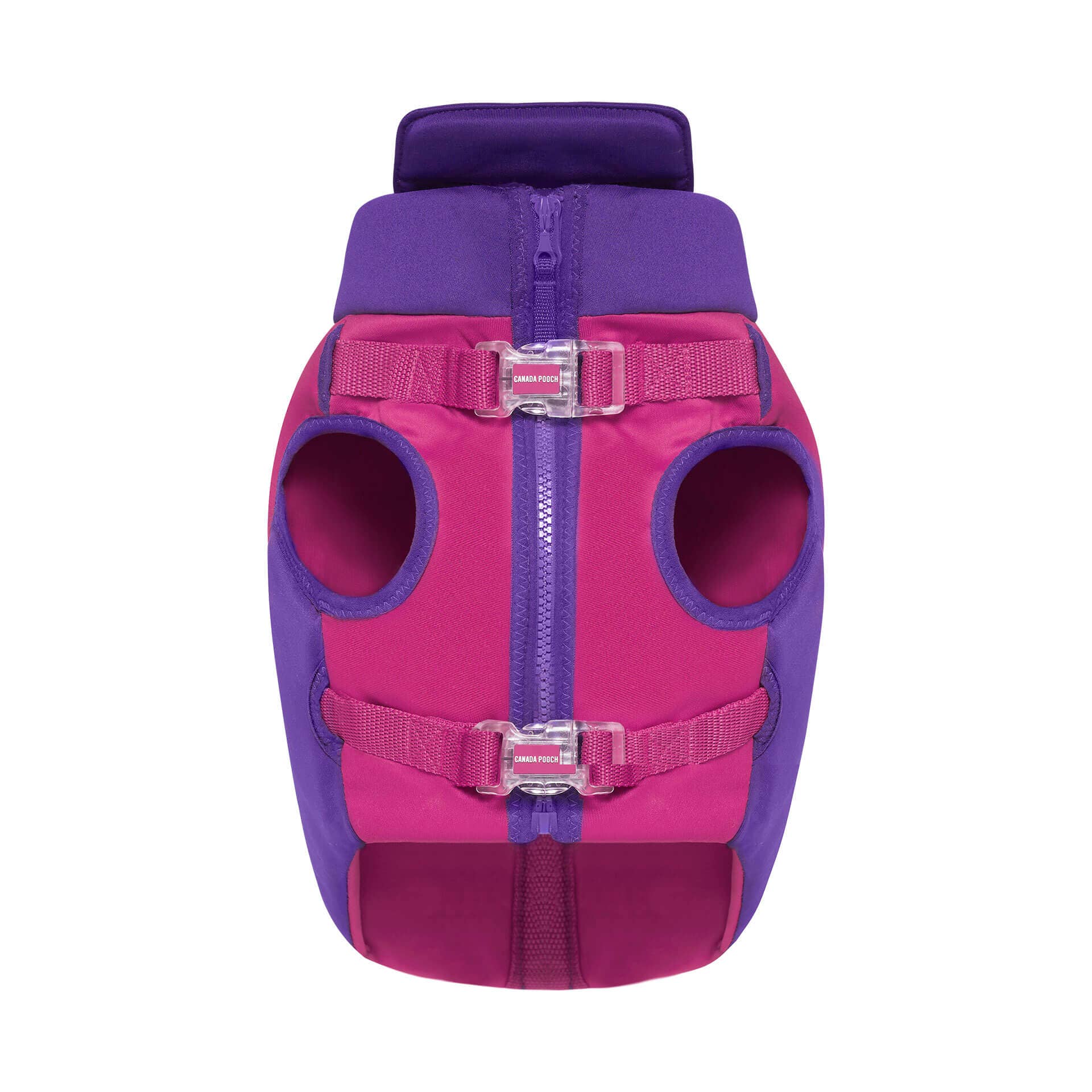 The full coverage dog life jacket for safer assisted swimming. - High buoyancy for safer assisted swimming. -Comfortable and stretchy fit for ultimate mobility. -Double front buckle with zipper closure for a secure fit. -Flotation head strap for extra support. -Rust-proof aluminum alloy D-ring for leash attachment. - Durable handle with neoprene padding for easy lift.