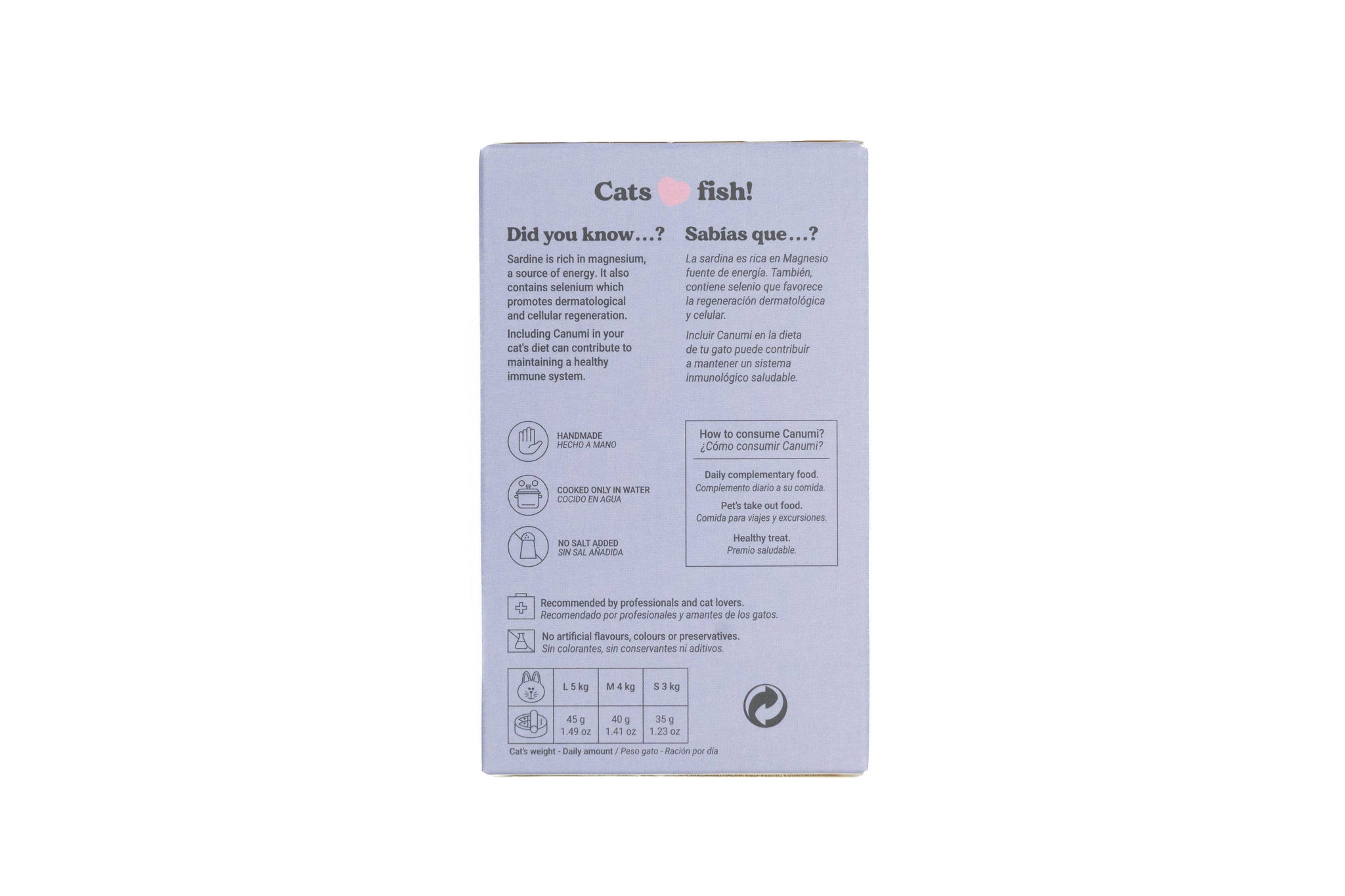 Sardines are a natural and abundant source of omega-3 fatty acids, such as EPA and DHA, essential for your cat's health. These fatty acids contribute to the development and proper functioning of brain, they maintain healthy skin, a shiny coat and promote an anti-inflammatory response in their organism. Cats need to ingest animal-based omega-3 fatty acids, such as EPA and DHA, because of their Carnivore conditions have difficulty efficiently converting the source omega-3 fatty acids plant, such as ALA, in EPA and DHA in adequate quantities. The cat is also not able to convert beta carotene into vitamin A and therefore needs to obtain the vitamin A directly from animal tissues, as well as from vitamin B3. Sardines stand out for their contains vitamin A, B2, B3 and B12. The mineral content contributes to an optimal nutritional balance. And its spine is high in calcium, which is easily digested when cooked.