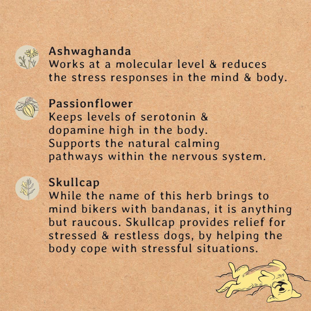 The perfect treat to help calm stressed and anxious doggies. A delicious peanut butter biscuit packed with natural adaptogens and superfoods to help reduce stress responses in the mind and body. Think vet trips, fireworks, thunderstorms, aggressive behaviour or being home alone. Ingredient benefits: Ashwagandha Works at a molecular level & reduces the stress responses in the mind & body. Passionflower Maintains the body’s levels of ‘happy chemicals’ – serotonin and dopamine. Supports the nervous system’s natural calming pathways to promote better responses to stress. Skullcap While the name of this herb brings to mind bikers with bandanas, it is anything but raucous. Skullcap provides relief for stressed & restless dogs and helps the body cope with stressful situations. Omega-3 Fish Oil (with EPA & DHA) Helps reduce anxiety, depression & hyperactivity. Promotes a shiny, healthy coat & skin, which always makes your fluff feel better! Each tub contains 40 biscuits.
