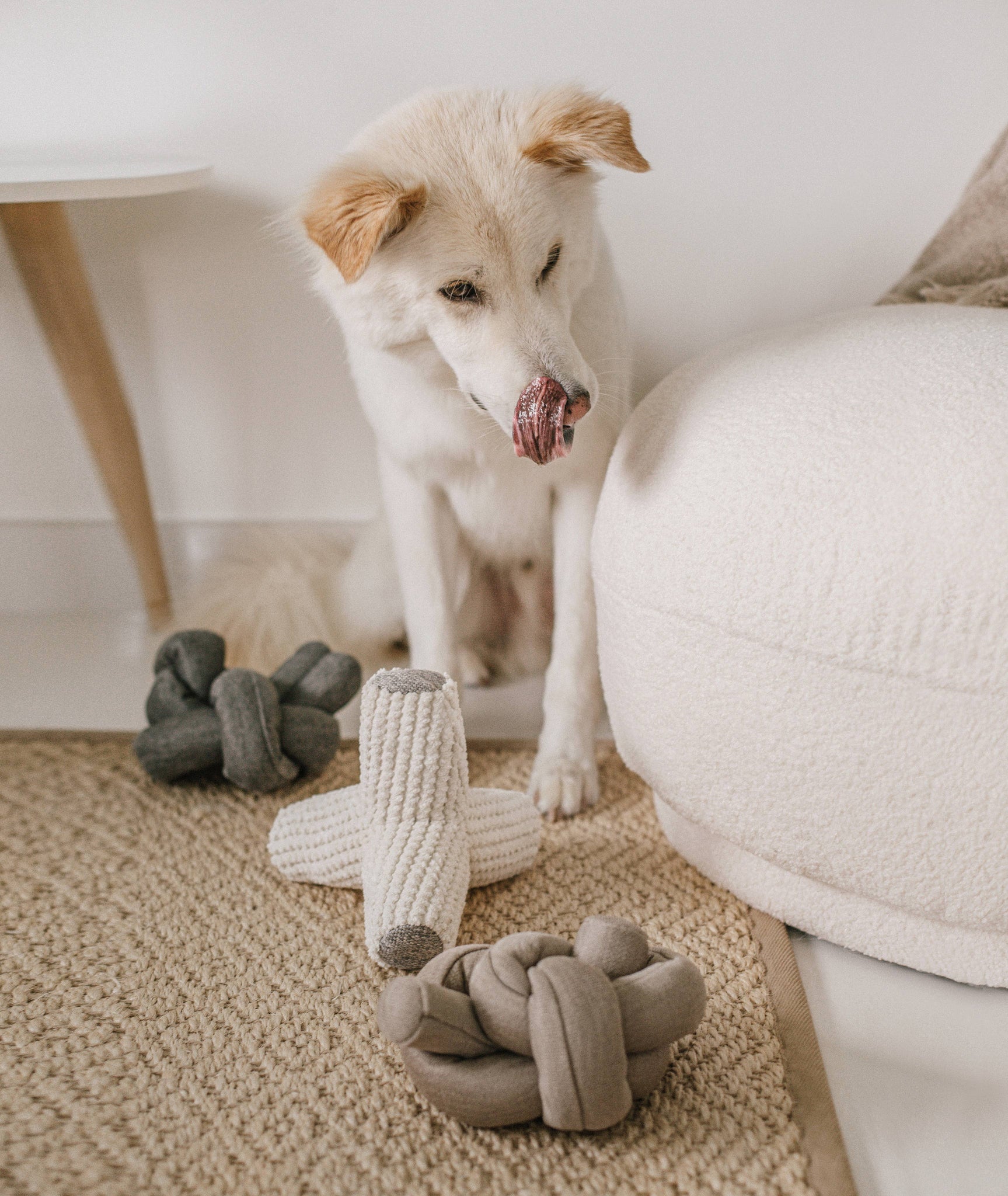 NOU (pronounced like 'noo' in noodles) is a play object designed for both your pet and you. To make it fun, the object invites you to be creative too in making various shapes. NOU can be a pretzel, a boating knot, a tossing ball or a tug of war rope. Works like an enrichment toy, treats can be hidden in the knots and rewarded when your pet successfully unknots them. If one Nou is too easy for the pet, level up and make more complicated shapes with two or three NOU!