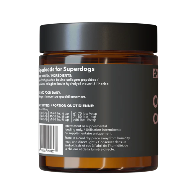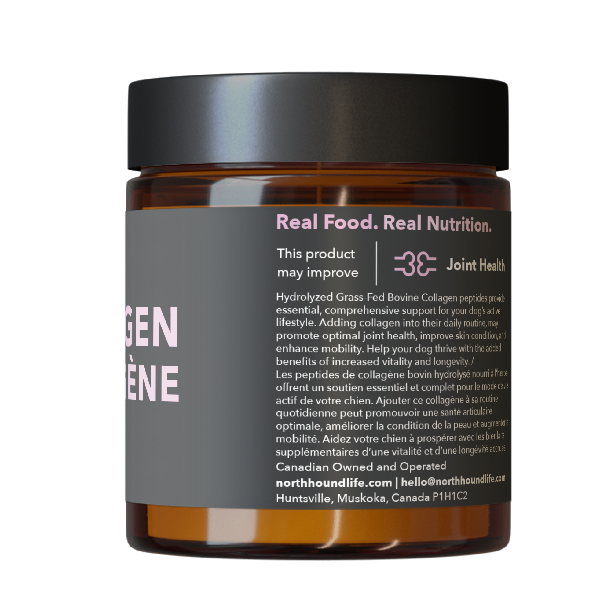 Enhance your dog’s active lifestyle with our Hydrolyzed Grass-Fed Bovine Collagen Peptides. This premium supplement is designed to proactively improve your dog’s joint health, enhance their skin condition, and boost mobility. By incorporating our collagen peptides into their daily routine, you’re giving your dog the gift of vitality, longevity, and overall well-being. 80 g in a recyclable glass jar.