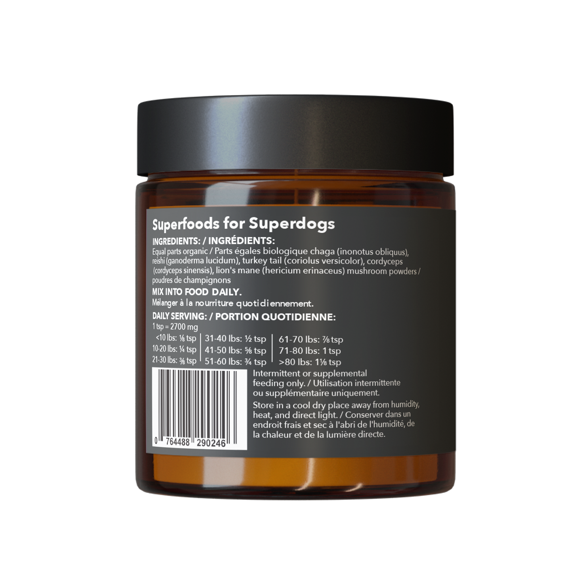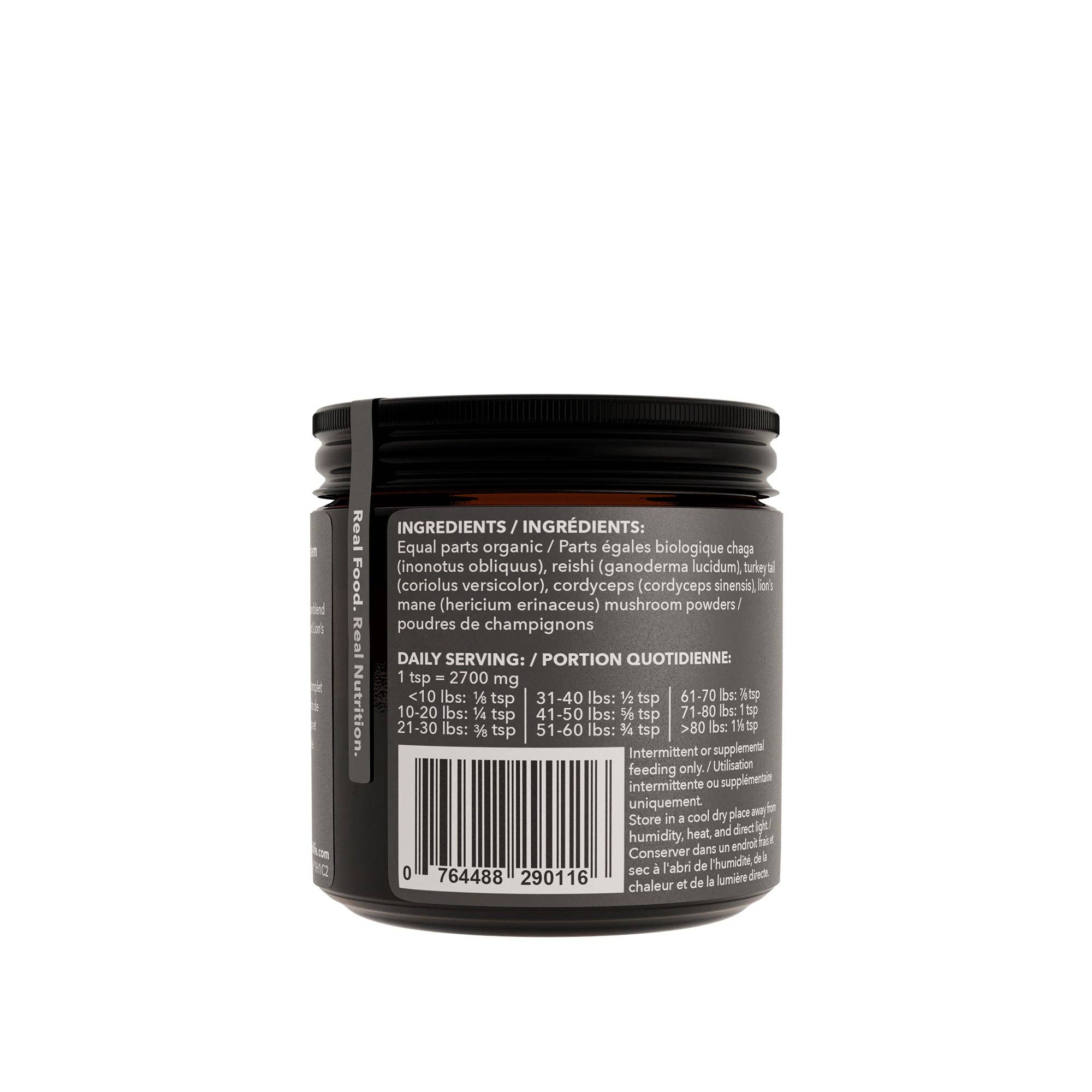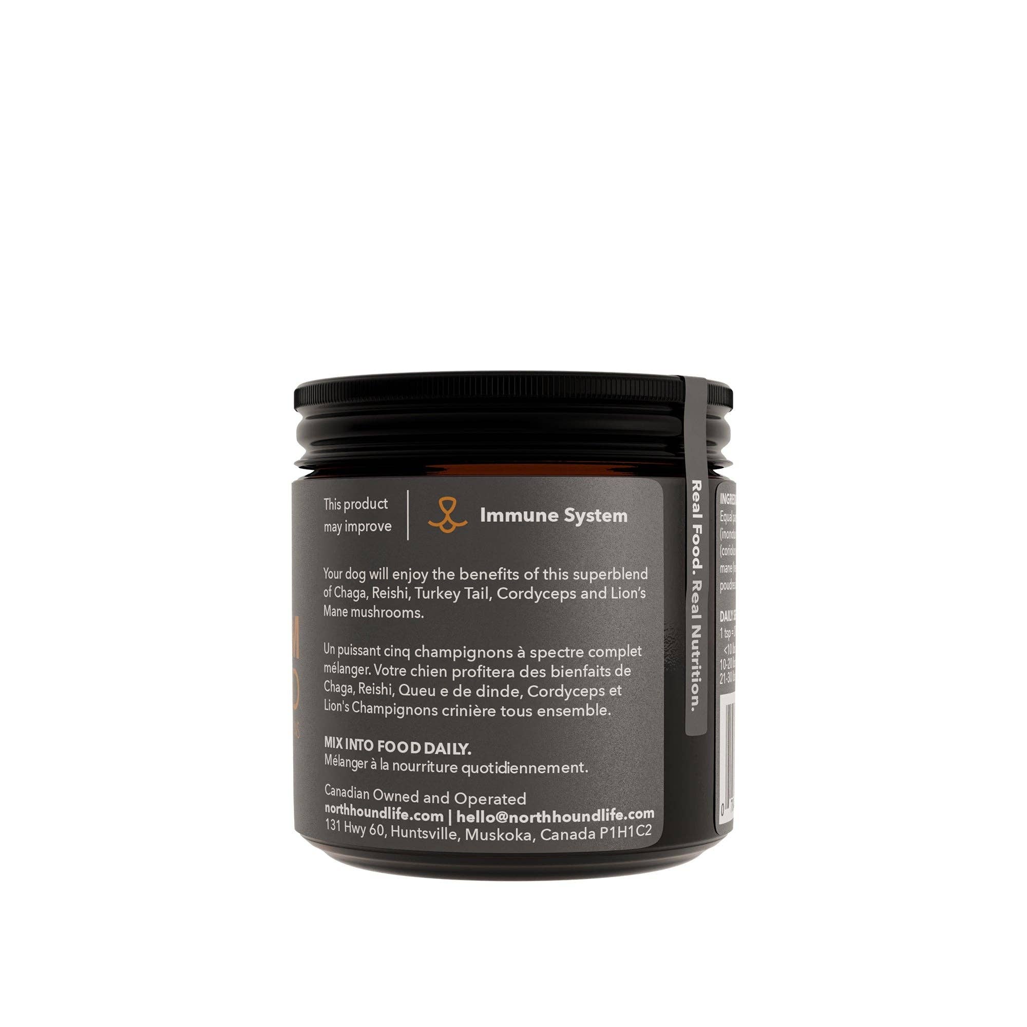 This Mushroom Superblend is a combination of five superfood mushrooms your dog may enjoy. Chaga (Inonotus obliquus), Reishi (Ganoderma lucidum), Turkey Tail (Coriolus versicolor), Cordyceps (Cordyceps sinensis), Lion's Mane (Hericium Erinaceus). Chaga: Research shows it may provide immune support, and gut support and may have anti-oxidant properties. Reishi: Research shows it may provide senior dog support and heart support. Also, it is known as the "longevity mushroom". Turkey Tail: Research shows it may provide immune support and have anti-tumor properties. Cordyceps: Research shows it may provide senior dog support and immune support.