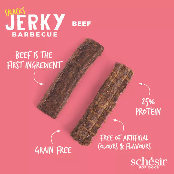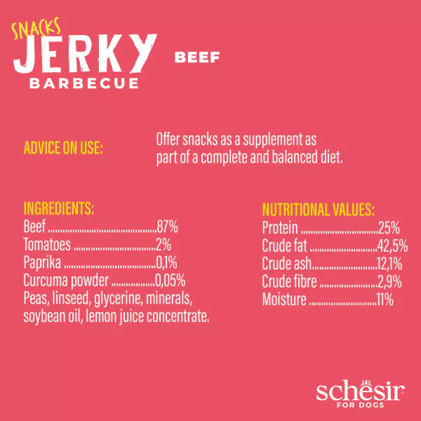 Without artificial colors and flavors Made in the USA Grain-free Perfect for a cuddle moment Real dried beef with barbecue flavor and 25% proteins. A tasty and delicious treat, perfect to pamper your furry family member and strengthen your special bond.