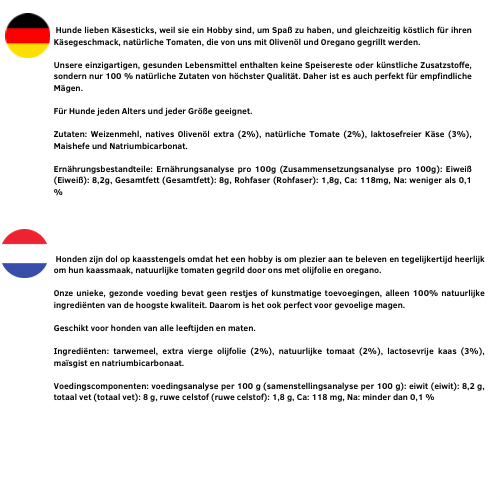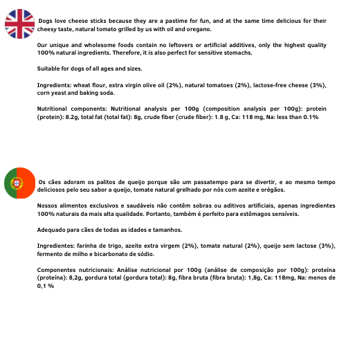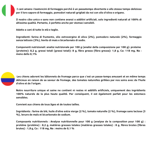 Pizzas are super delicious and are made for your pet to enjoy. Made with wheat flour, a light layer of homemade tomato with extra virgin olive oil, ideal for your skin and coat, lactose-free cheese and oregano so that everyone can enjoy this little treat. Our unique, healthy food contains no leftovers or artificial additives, only the highest quality 100% natural ingredients. So it's perfect for sensitive stomachs, too. Suitable for dogs of all ages and sizes. Made in Spain and delivered in 100% recyclable bags and boxes.