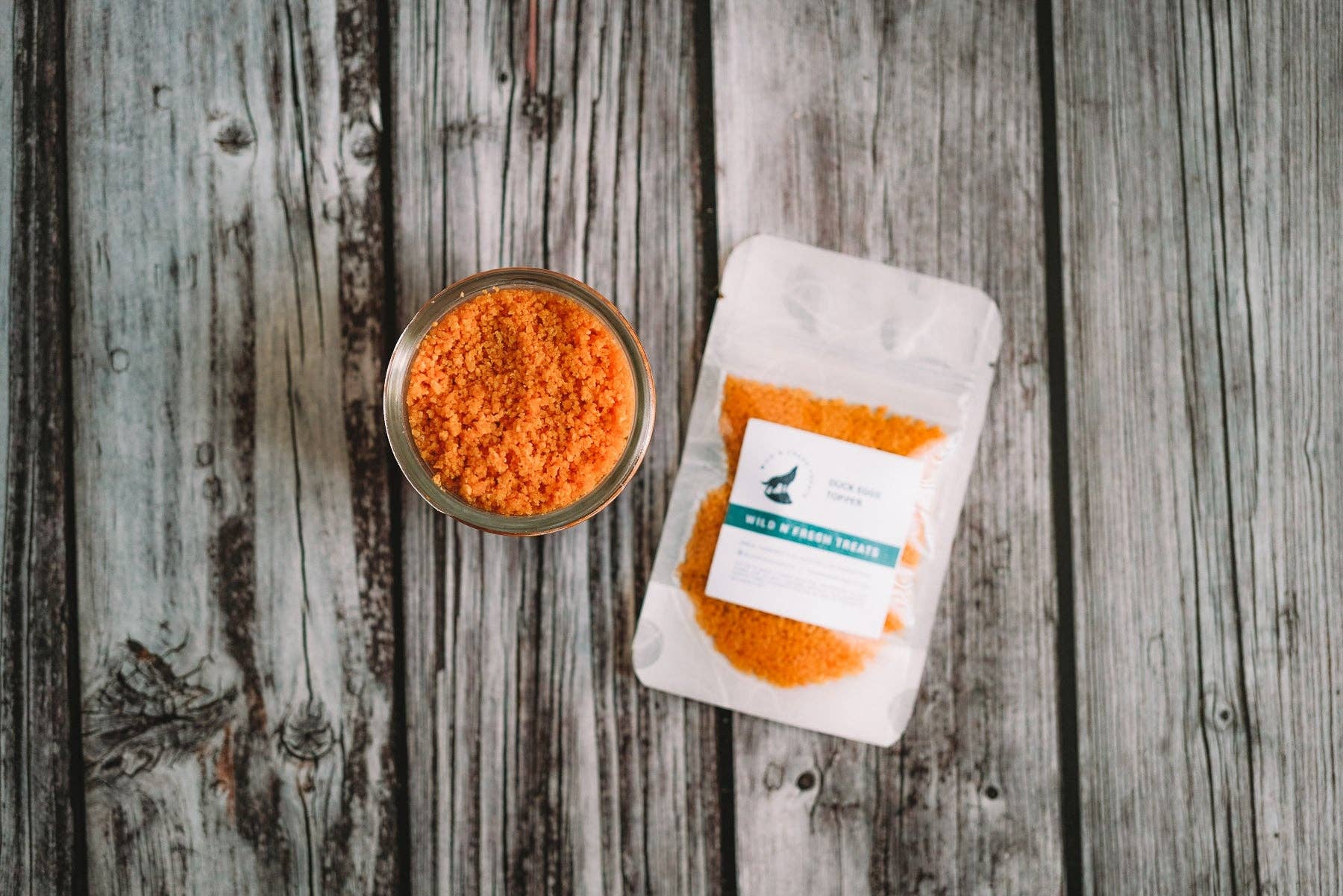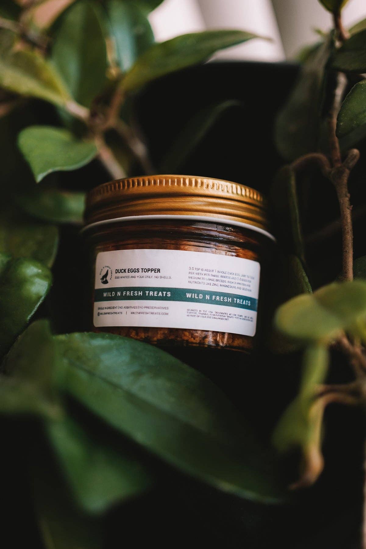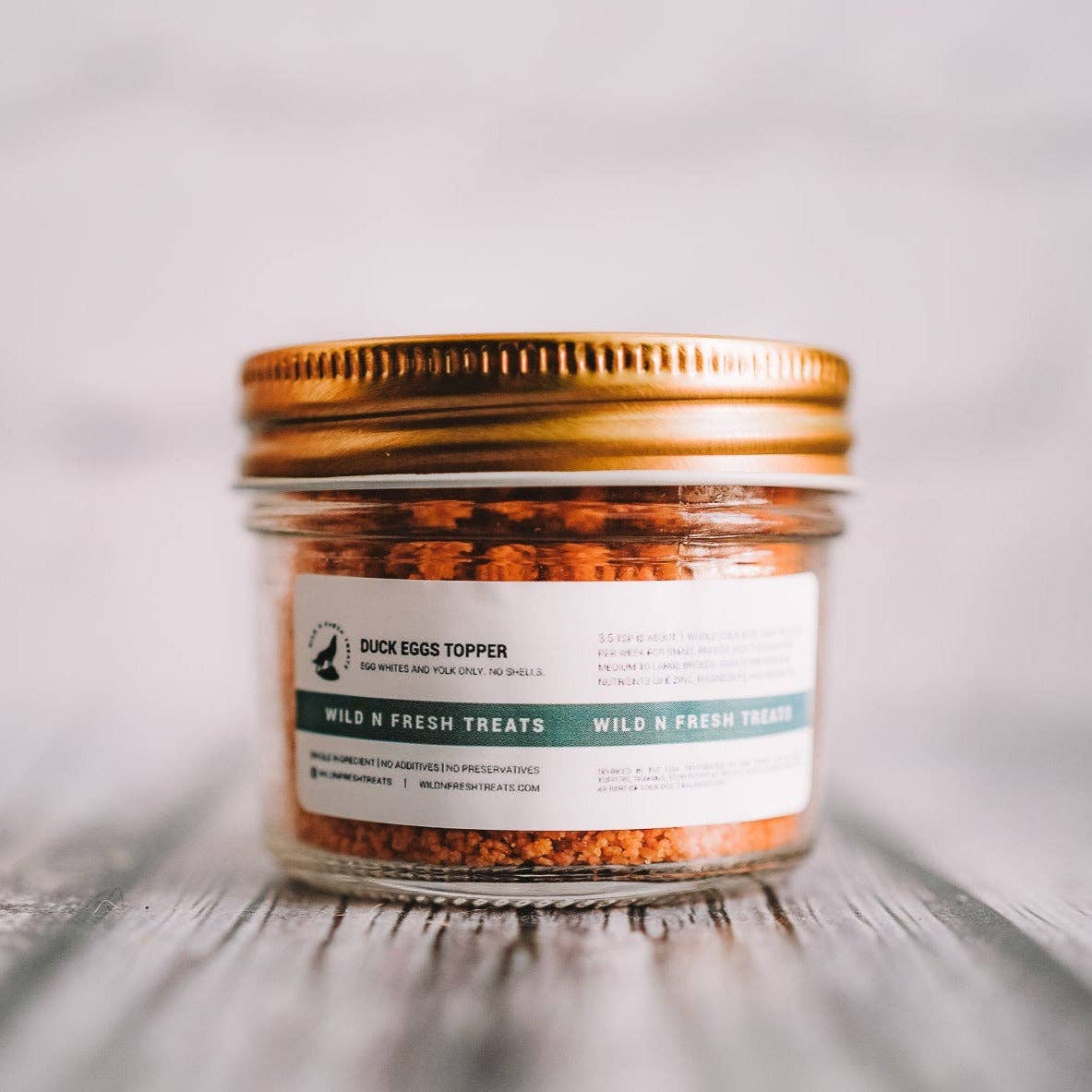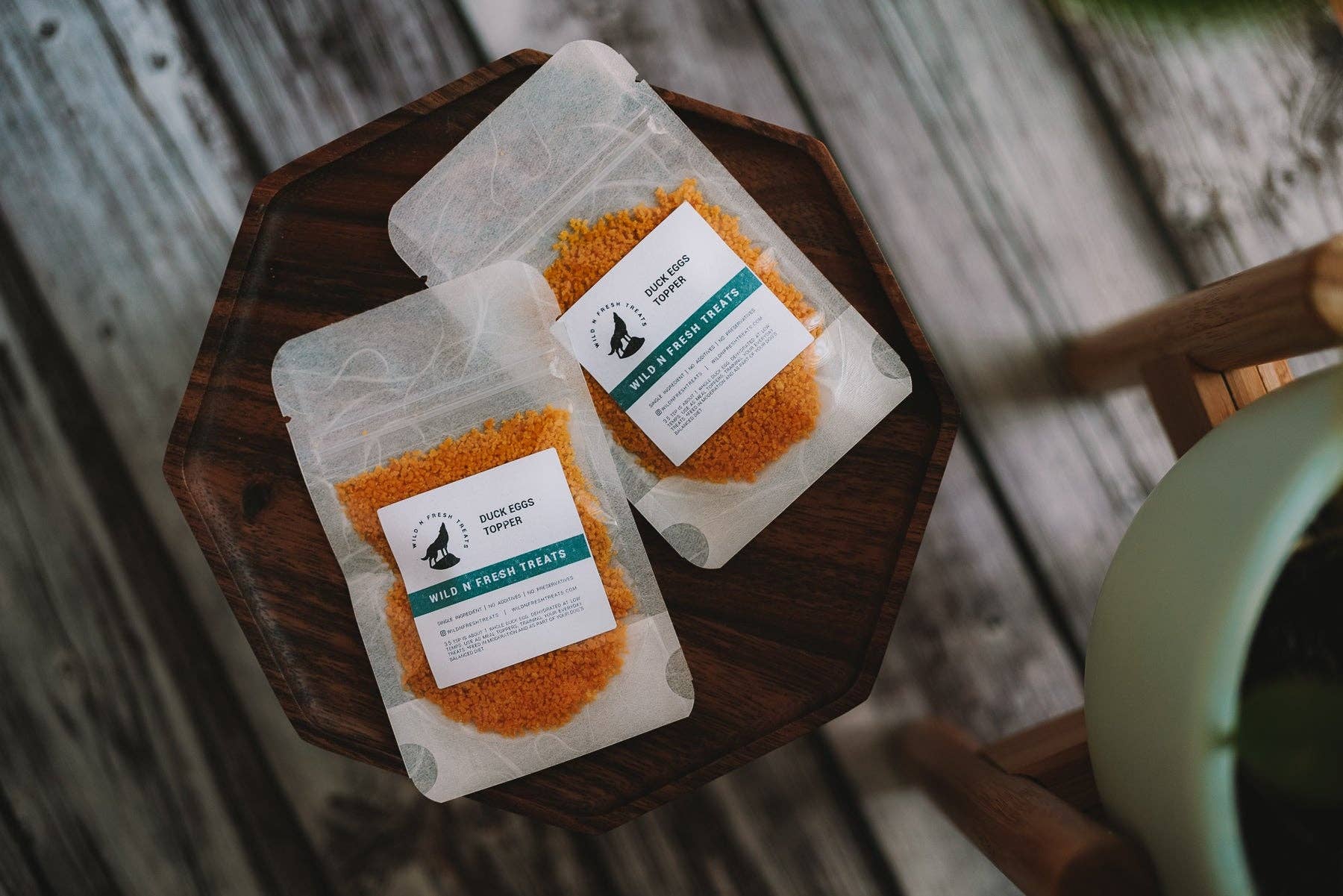 Whole duck eggs with shells. Duck eggs are a good source of Vitamins A, B1, B2, B5, B9 (Folate), B12, E, Iron, Phosphorus, Zinc, Selenium and Choline. Choline is an essential nutrient that helps the body’s cells communicate. It helps create neurotransmitters that facilitate nerve communication. Duck eggs have more Omega-3 fatty cells than in chicken eggs. Omega-3 fatty cells are believed to help dogs with skin conditions, heart health, kidney health, cognitive function, and arthritis issues. Each sample bag contains 0.6 oz of dehydrated duck eggs. Each reusable jar contains 2 oz of dehydrated duck eggs. Each refill bag contains 6 oz of dehydrated duck eggs. 0.58 oz is about 1 whole fresh duck egg. 1 tsp is about 1/4 whole fresh duck egg. Feeding recommendation: 1 tsp for every 20lb. Use as meal topper. Combine with yogurt, kefir or goat's milk for a fun DIY pet-safe snack.